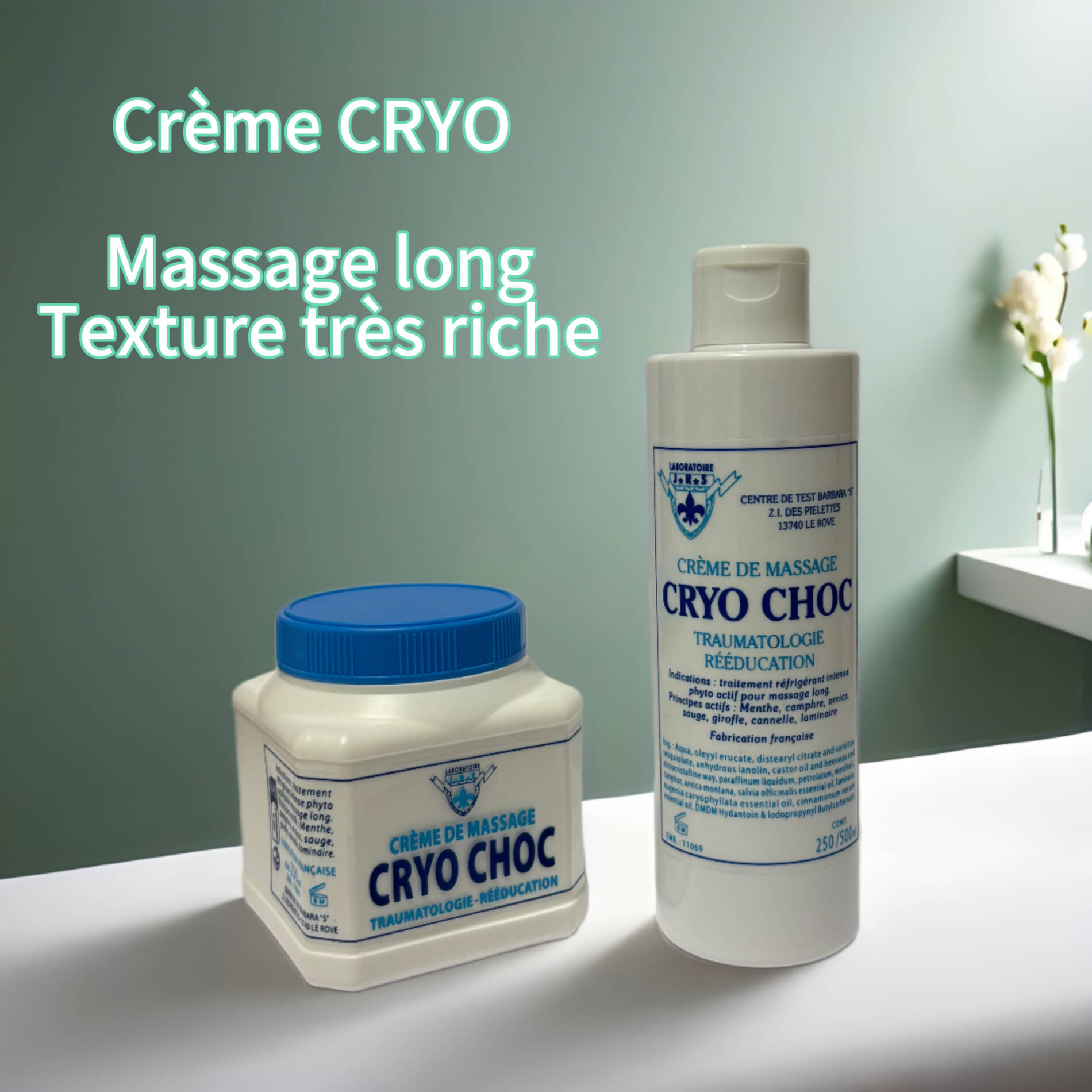 Attention à ne pas confondre avec le “Gel Cryo choc” qui pénètre rapidement, la “Crème Cryo Choc” demande un massage beaucoup plus long.